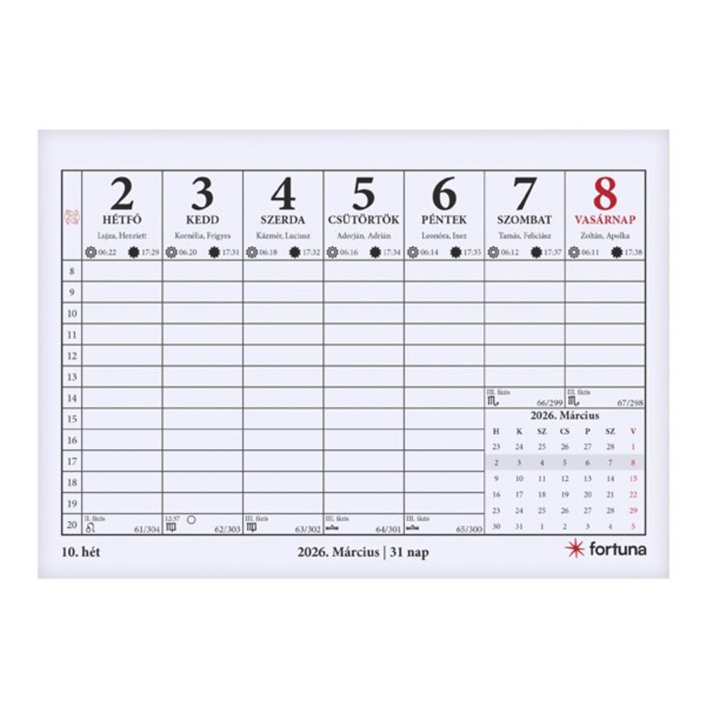Asztali naptár FORTUNA TA23 álló fehér lapos holdfázissal 2026.