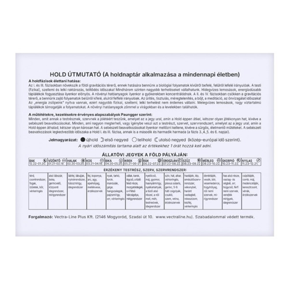 •    Az első oldalon részletes útmutató található a holdnaptár gyakorlati használatához, amely támogatja a természetes ciklussal összhangban álló mindennapi életvitelt.