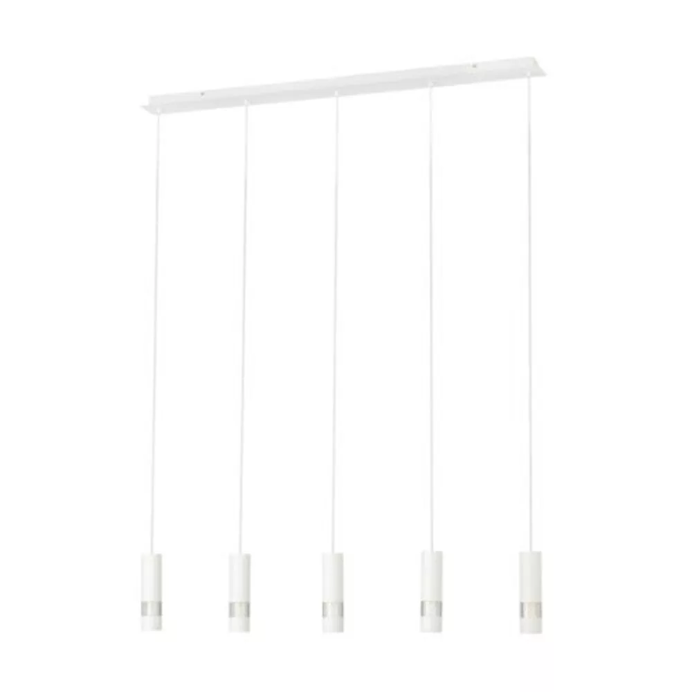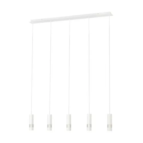 A BERNABETA LED függeszték öt hengeres lámpatesttel és fehér fém mennyezeti tartóval rendelkezik. Minden lámpatest alsó részén található egy átlátszó műanyag elem levegőbuborékokkal, amely különleges világítási hatást teremt a helyiségben. Ez a függeszték tökéletes befejezése a modern és minimalista enteriőröknek, egyedülálló világítási megoldást kínálva, legyen szó nappaliról vagy egy hosszú étkezőasztal fölötti megoldásról. A termék GU10 LED fényforrásokat tartalmaz, amelyek kellemes meleg fehér fényt biztosítanak.