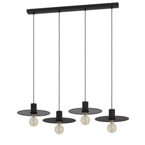 Az IKESTON függeszték lámpa négy lámpatartóval rendelkezik, amelyek fekete fém lámpafoglalattal és kör alakú hálós elemekkel vannak ellátva. A lámpafejek különböző magasságokban lógatva helyezkednek el egy kerek fekete fém mennyezeti takaróelemről, fekete textilkábelekkel. A design jellemzője a látható izzók, amelyek modern ipari megjelenést kölcsönöznek a terméknek. A függeszték szinte bármilyen belsőépítészeti stílushoz illeszkedik, és egy különleges világítási megoldást kínál bármely tér számára, legyen az nappali vagy étkező. Fontos megjegyezni, hogy a képen látható filament izzók nem tartozékai a terméknek. A termék E27-es foglalatokat tartalmaz, és E27-es fényforrásokat igényel.