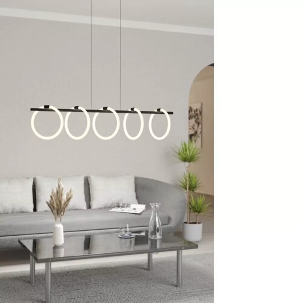 Az EGLO LED beltéri lámpa elegáns megjelenésével és modern dizájnjával kiváló választás minden otthonba. A fekete acél burkolat és a fehér műanyag búra harmonikus kontrasztot alkot, miközben a 3000 Kelvin színhőmérséklet meleg fényt biztosít. A termék maximális teljesítménye 5x7W, így 7000 lumen fényáramot biztosít, ami tökéletes a tágas helyiségek megvilágítására.