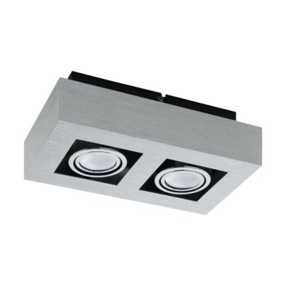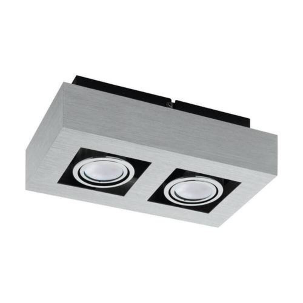 Ez a felületszerelt lámpatest a LOKE 1 sorozatból kefélt alumíniumból és krómozott, fekete acélból készül. Két GU10-LED-lámpával szerelték fel, amely meleg fehér fényt biztosít.