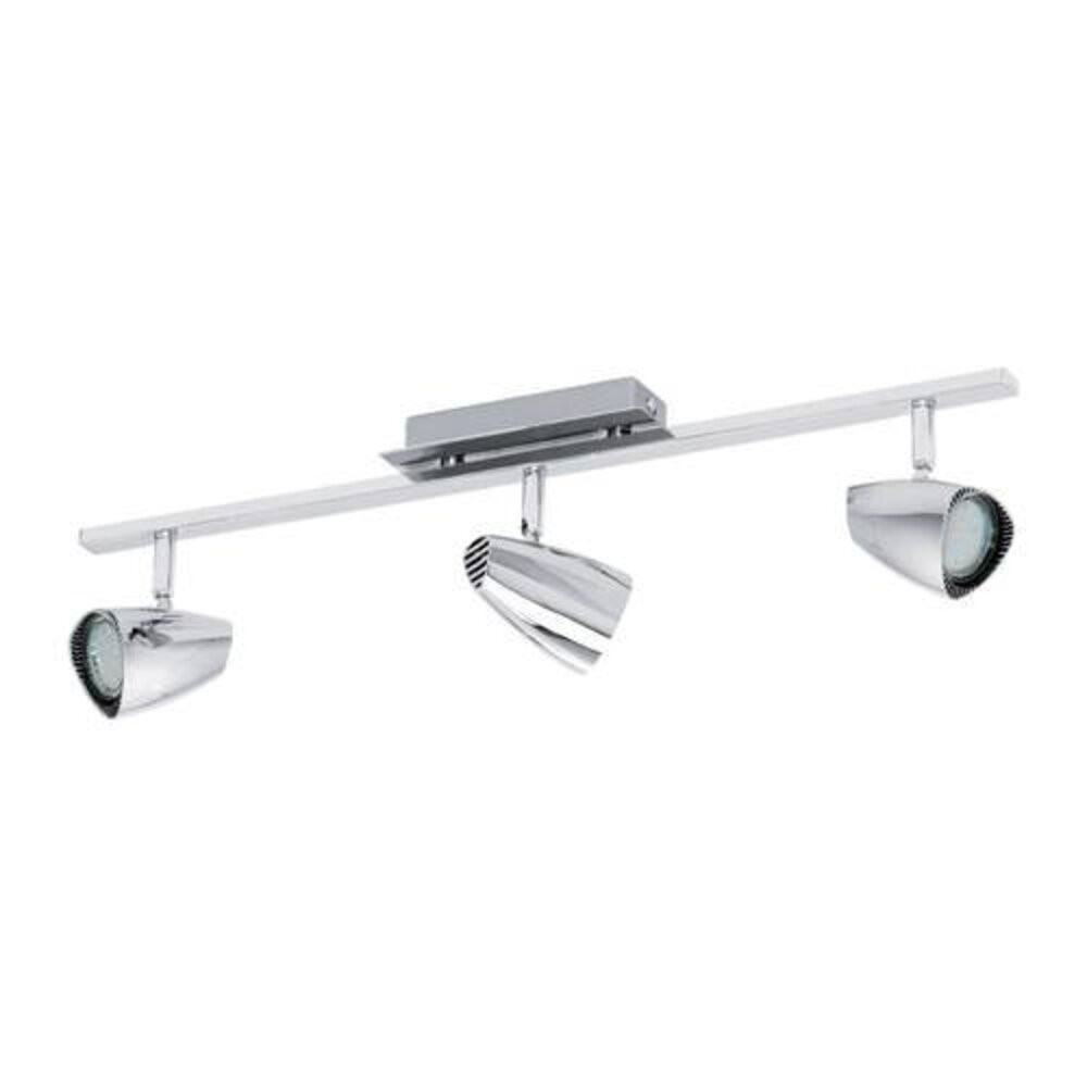 Ez a háromfejű spotlámpa a CORBERA sorozatból krómozott acélból és műanyagból készült, és három GU10-LED-lámpával van felszerelve a meleg fehér fényért.