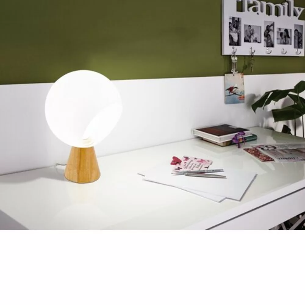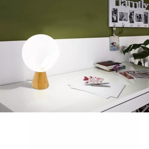 A MAMBLAS asztali lámpa tölcsér alakú, barna fa alappal rendelkezik, melyhez szférikus fehér fej párosul. A fejen található kör alakú kivágás közvetlen betekintést nyújt a belsejében lévő izzóra. A klasszikus asztali lámpa szinte bármilyen modern belsőépítészeti trenddel összhangban van, és az in-line kapcsoló segítségével be- és kikapcsolható. Az izzó nincs tartozékban. A termék E27 foglalattal rendelkezik, és E27 izzót igényel.