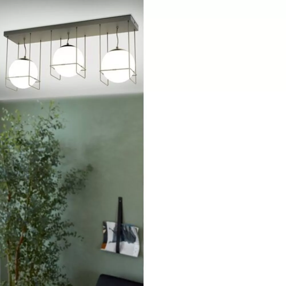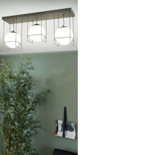 A VERSUOLA mennyezeti lámpa fekete befejezésű és három fekete drótból készült kerettel rendelkezik. A keretekben három fehér opálgömb található, amely kiegészíti a mennyezeti lámpa egyedi megjelenését. A design modern belső terekhez illeszkedik és látványos világítást teremt bármilyen térben, tökéletes a nappali vagy hálószoba számára. A fényforrások nincsenek tartozékban. A termék E27 foglalattal rendelkezik és E27 fényforrást igényel.