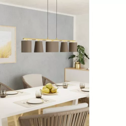 Az ALMEIDA 2 mennyezeti lámpa elegáns fényforrást kínál modern belső terekhez. A fényforrások nem tartozékai a terméknek. A fém alap csiszolt sárgarézből készült, hosszan elnyúló fém tartóval, mely szintén azonos színű. A három cappuccino színű textil búra belseje szintén csiszolt sárgaréz, amely vonzó megjelenést biztosít, továbbá a kúpos és ovális formák fokozzák az esztétikai élményt. A 60-as éveket idéző retro-chic dizájn remekül illeszkedik a modern lakásokhoz, és kellemes világítást teremt a nappaliban, hálószobában, étkezőben vagy folyosón. A lámpa 5 darab E27 foglalatú fényforrást igényel, melyek nem tartozékai a csomagnak.