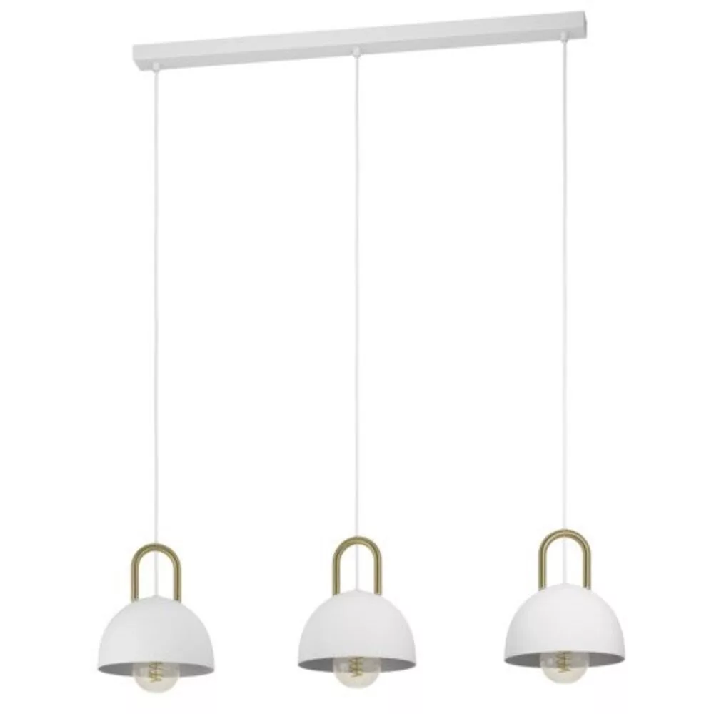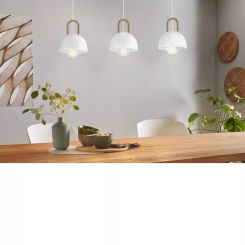 A CALMANERA függeszték lámpa három felfüggesztett, kerek fehér fém lámpabúrával rendelkezik. Minden lámpabúra egy dekoratív sárgaréz külső díszítéssel készült, fehér textilkábelen lóg. Az expozícióban lévő izzók gyönyörűen teljesítik a minimalista, mégis bájos dizájnt. Ez a függeszték lámpa egyedi világítást biztosít bármely modern élettérben, akár a nappaliban, akár egy hosszú étkezőasztal fölött. A termékhez 3 x E27 fényforrás szükséges, amelyek nem tartozékai a csomagnak.