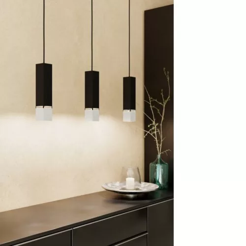 A BUTRANO függőlámpa három, fekete fém testből készült, ezüst színű fém kiegészítőkkel. A két elem négy diszkrét fém rúddal van összekapcsolva. A lámpa felső része beépített fényforrástartókat rejt, ami csillámmentes világítást biztosít. A csomagban található GU10 LED izzók kellemes meleg fehér fényt bocsátanak ki. A lámpa lineáris formatervezése lehetővé teszi, hogy széleskörű belső terekbe illeszkedjen, modern világítást biztosítva a nappaliban vagy egy hosszú étkezőasztal fölött. A fényforrás tartozék a termékhez.