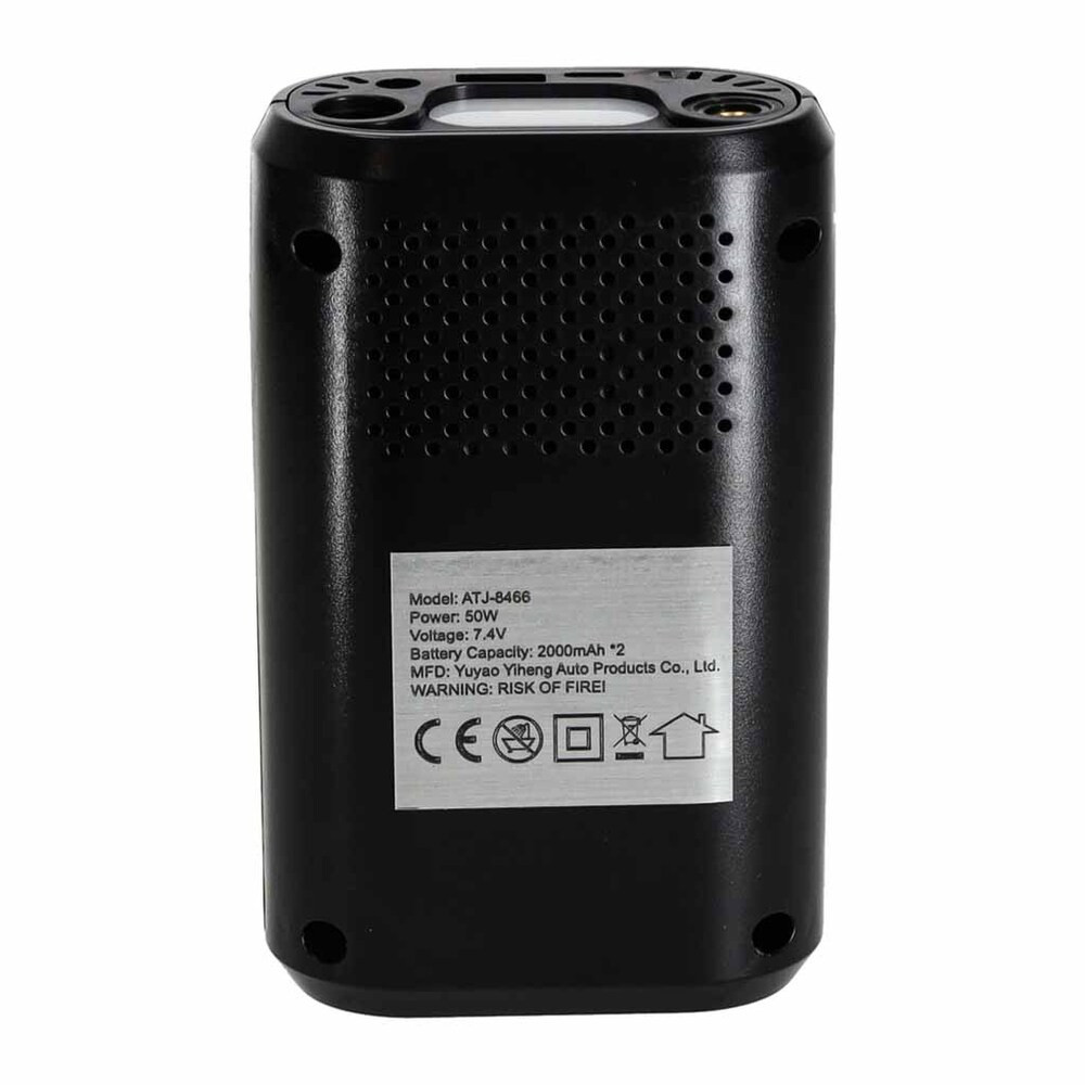 Használat előtt olvassa el a használati útmutatót. Ne tegye ki a terméket tűznek, víznek, nedvességnek vagy magas hőmérsékletnek. Ne szerelje szét a készüléket. Működés közben ne hagyja felügyelet nélkül. Működés közben ne takarja le a készüléket – túlmelegedhet. Kizárólag a mellékelt tartozékokat használja. Teljesítmény: 80 W, Töltési feszültség: 7,4 V, Akkumulátorkapacitás: 2 x 2000 mAh, Maximális nyomás: 150 PSI (10 bar)
