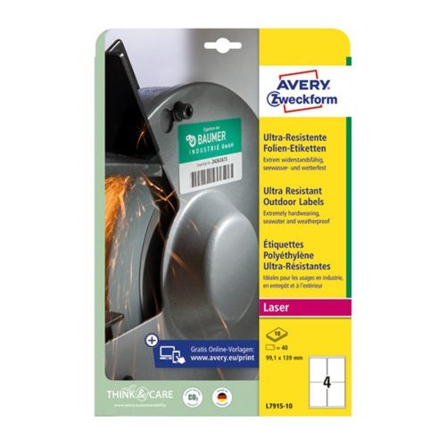 Az Avery Zweckform L7915-10 cikkszámú, fehér, ultra ellenálló film címkéit, lézernyomtatókhoz 99,1x139 mm méretben kiemelkedően nagy strapabíróság jellemzi, hogy megfeleljen a legmagasabb követelményeknek bel- és kültéren egyaránt.