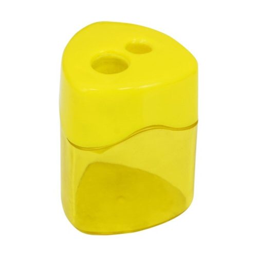 Hasáb alakú, áttetsző, műanyag tartályos, 2 lyukú hegyező, sárga színben.