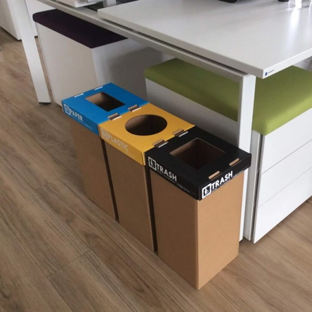 Erősített (5 rétegű), 100%-ban újrahasznosított kartonból készült, Magyarországon gyártott, beltéri szelektív hulladékgyűjtő. Teteje vízhatlanított, nedves ronggyal tisztítható. Belső részét a csomaghoz kapott műanyag zsák védi meg a beázástól.