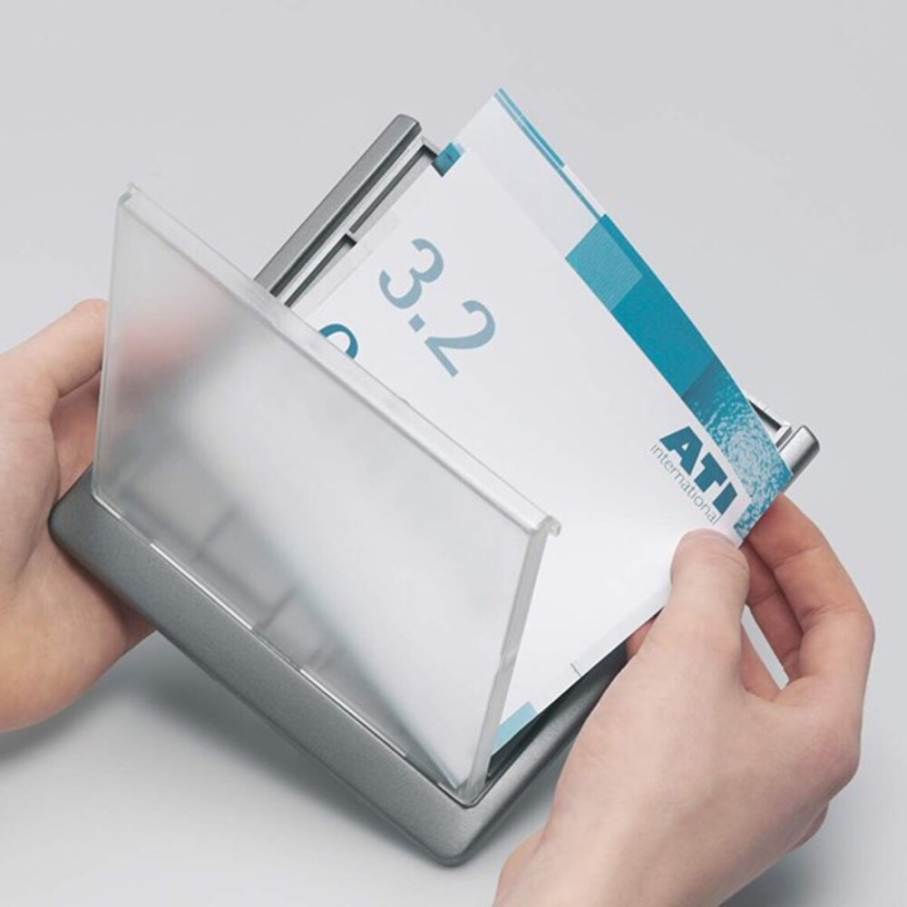 A DURABLE Click Sign A/5 fekvő irányítótábla 148x210 mm-es grafit színben praktikus választás az irodai kommunikációhoz. Az A/5 méret ideális a hirdetések, információk vagy értesítések letisztult és rendezett bemutatására. A Click Sign rendszer lehetővé teszi a gyors cserét és frissítést, így a felhasználók könnyedén alkalmazhatnak új üzeneteket anélkül, hogy a tábla keretét cserélni kellene. Az irányítótábla strapabíró anyagból készült, amely hosszú távú használatot garantál, ideális választás bármilyen munkahelyi környezetbe.
