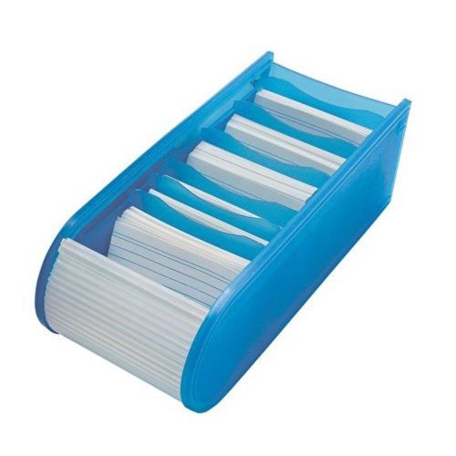 Műanyag asztali kartotékozó, 6 műanyag elválasztóval, 100 ív A/8 méretű( 52mm x 73 mm) vonalas betétlappal. 500 db kártya tárolására alkalmas. Külső mérete: 8,9x21,5x7,3cm.