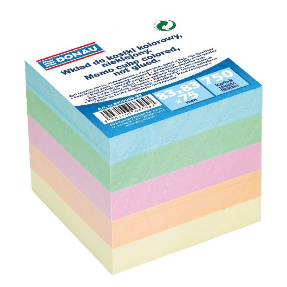 Nem ragasztott, környezetbarát kockatömb pasztell vegyes színekben. Papír tartó utántöltésére. Feljegyzésekhez, emlékeztetőkhöz vagy üzenetek hagyására irodában vagy otthon egyaránt használható.