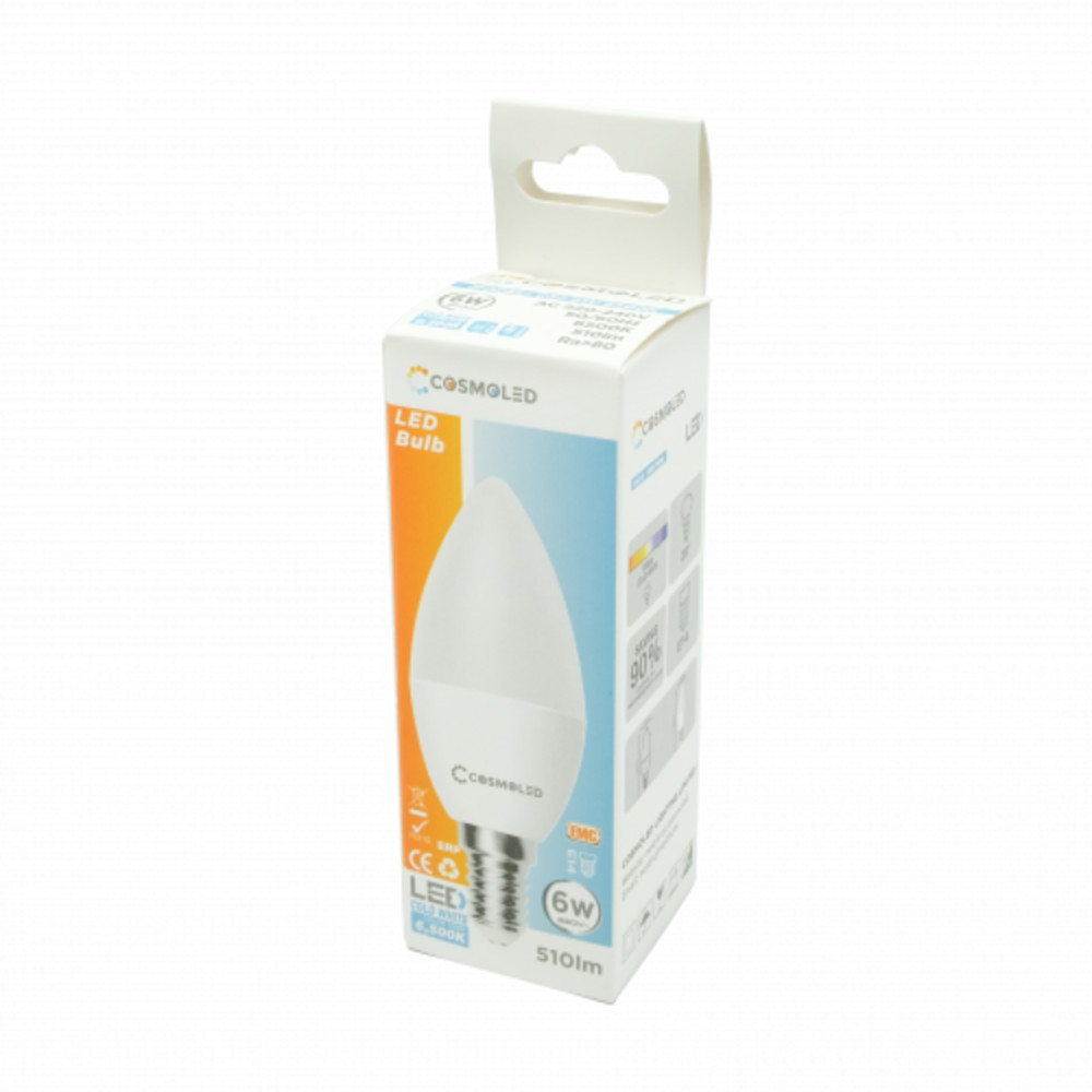 LED lámpa , égő , gyertya , E14 foglalat , 6W , hideg fehér , COSMOLED