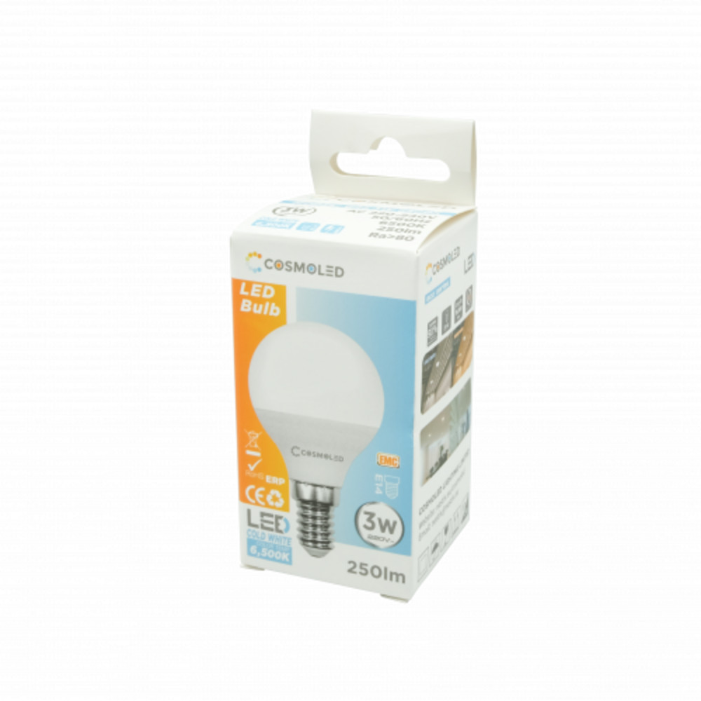 LED lámpa , égő , kisgömb , E14 foglalat , 3W , hideg fehér , COSMOLED