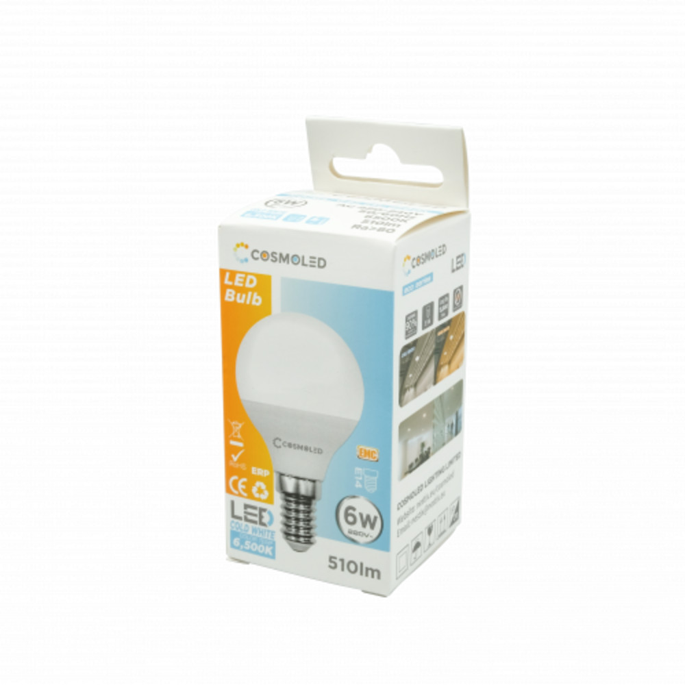 LED lámpa , égő , kisgömb , E14 foglalat , 6W , hideg fehér , COSMOLED