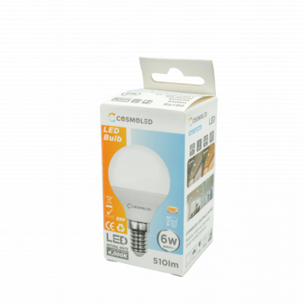 LED lámpa , égő , kisgömb , E14 foglalat , 6W , meleg fehér , COSMOLED