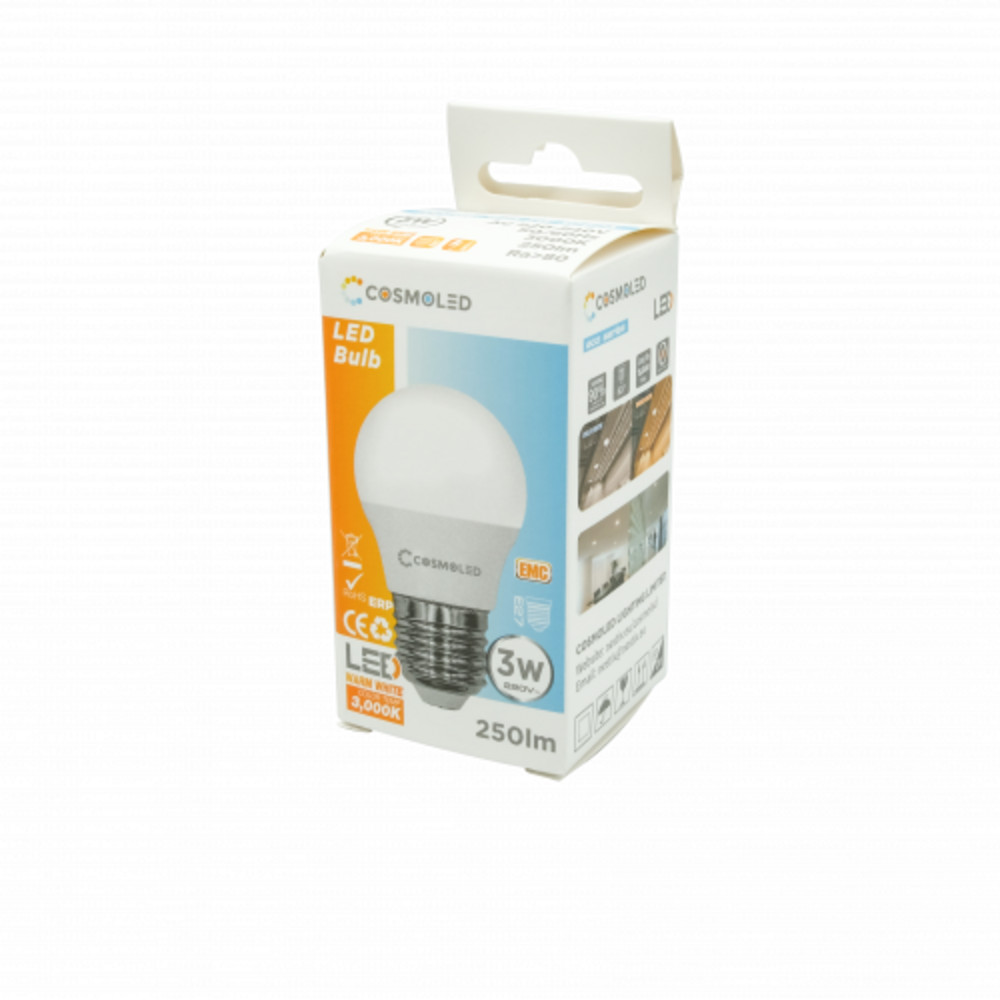 LED lámpa , égő , kisgömb , E27 foglalat , 3W , meleg fehér , COSMOLED