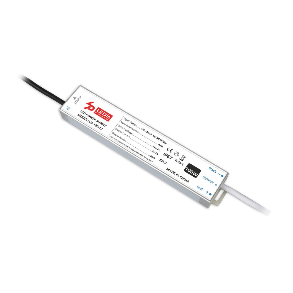 LED tápegység , 12 Volt , 100 Watt , 8.33A , slim , kültéri , vízálló , IP67 , 3+2 év garancia , LEDis , LD-100-12