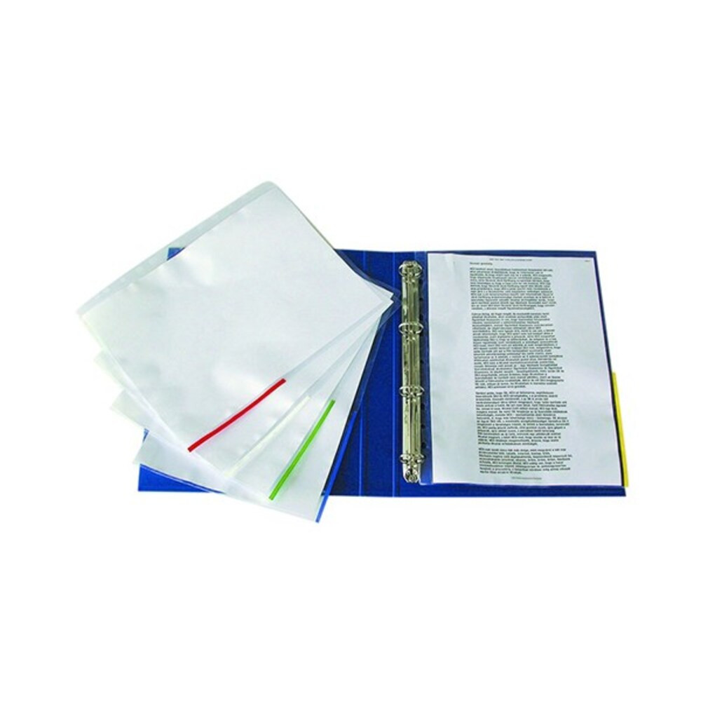 Erős lefűzhető tasak folyamatos, mindennapos használatra. Kényelmes tárolást biztosít iratrendezőkben, gyűrűskönyvekben. A színes perem megkönnyíti a dokumentumok rendszerezését. Víztiszta felületű, 105 mikron vastag, újrahasznosítható PP alapanyag. A színes perem lehetővé teszi a színkódolásos rendszerezést. Felül és jobb oldalon nyitott. A 11 lefűzőlyuknak köszönhetően bármilyen iratrendezőben, gyűrűskönyvben használható. A4 mérethez.