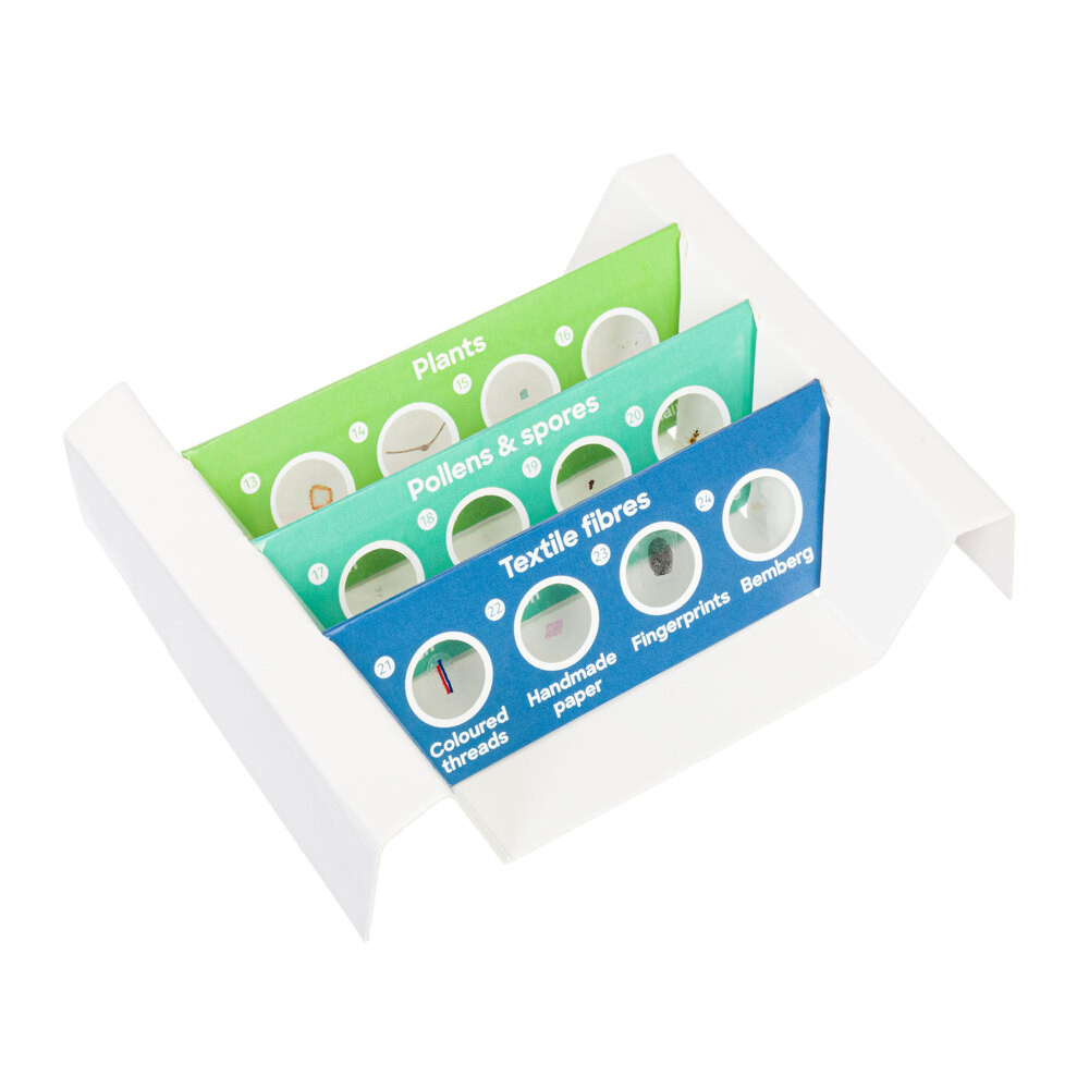 Az összes minta három csoportba osztható kategóriák szerint. Az egyik tárgylemez egyike annak a csoportnak, amely négy mintát tartalmaz. Minden minta fel van címkézve, hogy könnyen megtalálhassa azt, amelyiket tanulmányozni szeretné. Ez a készlet kiváló kiegészítő minden alacsonyabb megvilágítású biológiai mikroszkóphoz, beleértve a gyerekeknek készült modelleket is. A tárgylemezek bármilyen márkájú mikroszkóppal használhatók.