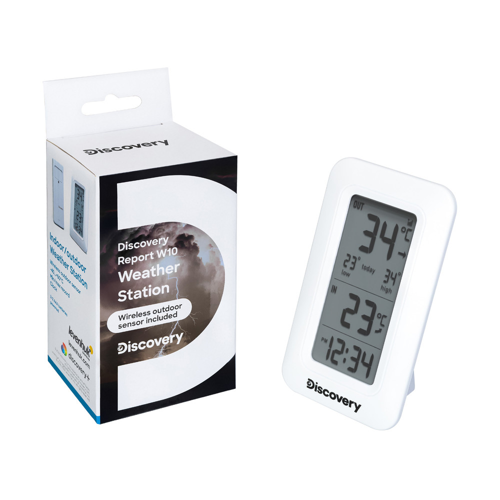 A Levenhuk Discovery Report W10 órával rendelkező időjárás-állomás a modern lakberendezés stílusos és funkcionális kiegészítője, amely képes figyelemmel kísérni a hőmérséklet-változásokat a helyiségen belül és az ablakon kívül. Mutatja az aktuális időt és jelzi a mért hőmérséklet legalacsonyabb és legmagasabb értékeit. A készlet távérzékelőt tartalmaz.