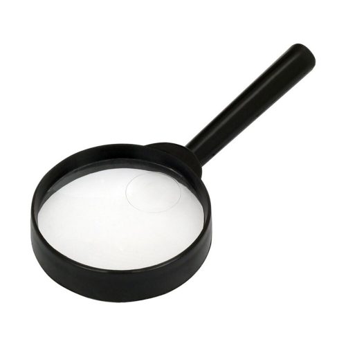 Műanyag keretes kézi nagyító, 5-szörös nagyítás. Fogantyús, torzításmentes üveg, átmérő: 50 mm