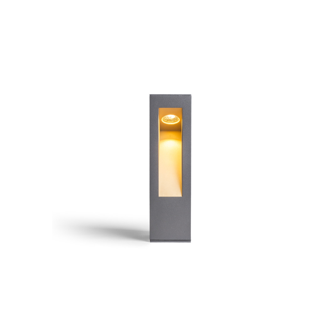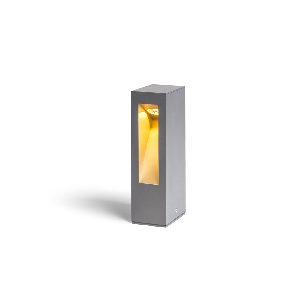 Kültéri állólámpa. A fényforrás körüli tér aranyszínűre van festve, ami lágy, meleg fényt eredményez.