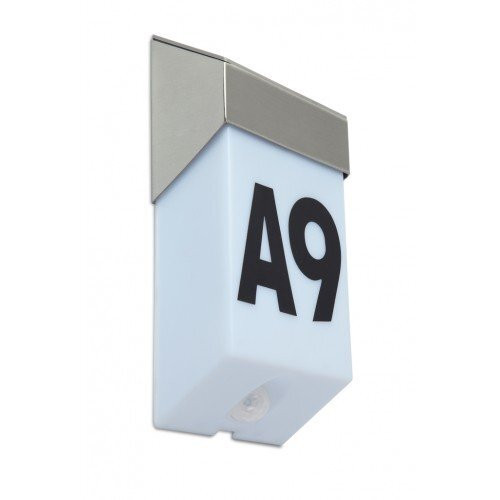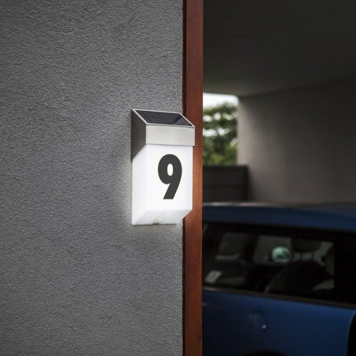 LUTEC SOLSTEL, kültéri LED lámpa házszám kijelzővel és számkészlettel, vízálló az IP44 védelemnek köszönhetően, kültéri LED lámpa mozgásérzékelővel. A SOLSTEL típus emellett állólámpaként is elérhető.