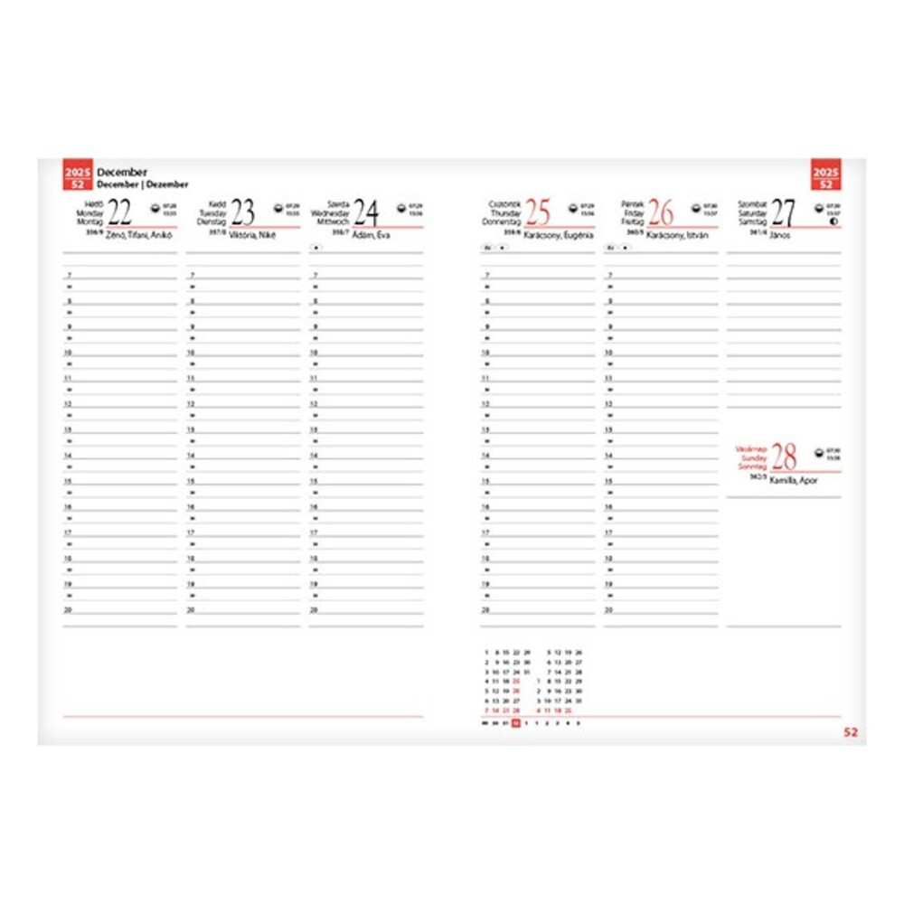 48 oldal információ, órarend, osztálynévsor, 108 oldal heti beosztású naptár (2025. augusztus 18.-tól 2026. augusztus 23.-ig), 28 oldal jegyzetlap és 8 oldal telefonregiszter