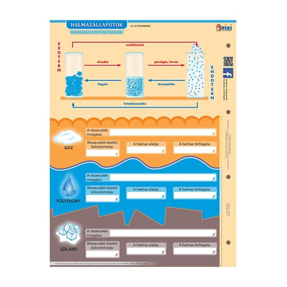 Halmazállapotok tanulói munkalapunk bemutatja a különböző halmazállapotokat, illetve azok változásait, az exoterm és endoterm folyamatokat.