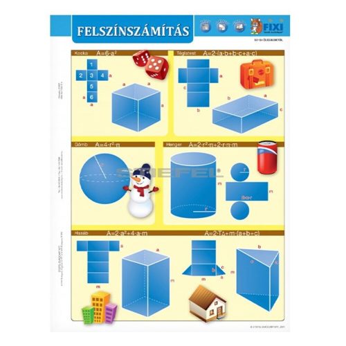 A felszínszámítás áttekintése szemléletes rajzokkal, amelyek segítenek a tanultak rögzülésében. Hátoldalán egyszerű számításokkal.