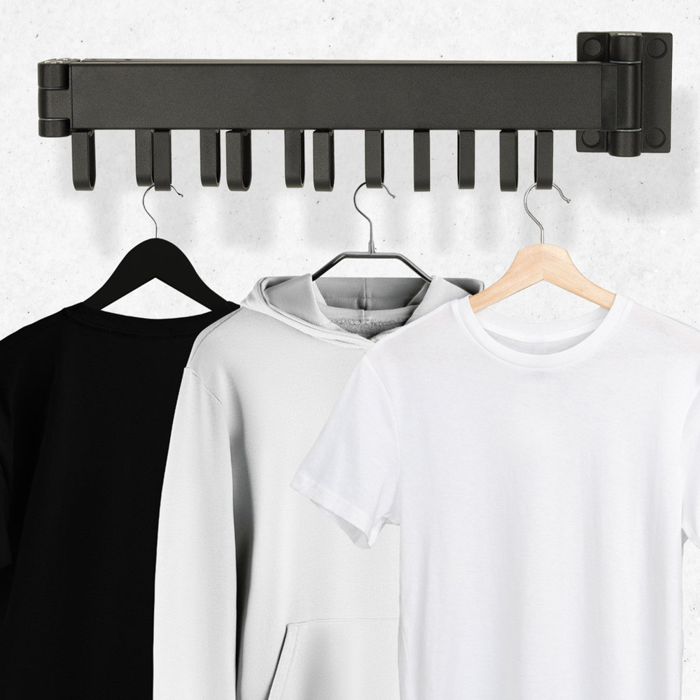 Ruhaszárító állvány, falra szerelhető, összecsukható, teleszkópos, fekete, 18 akasztó, 123 cm