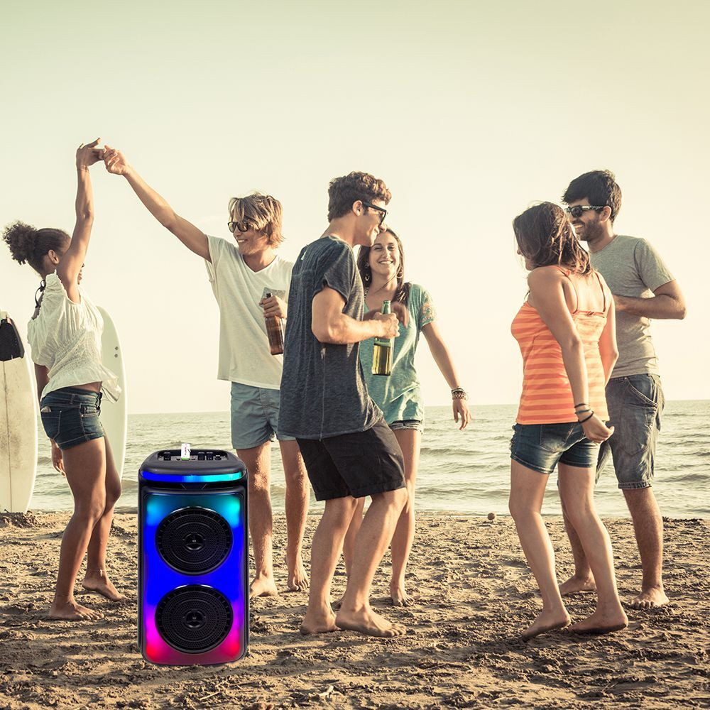 RGB Bluetooth hangszóró , party hangfal LED világítással , mikrofonnal , távirányítóval , 2 x 10 watt , USB , tölthető , 54 x 27 cm