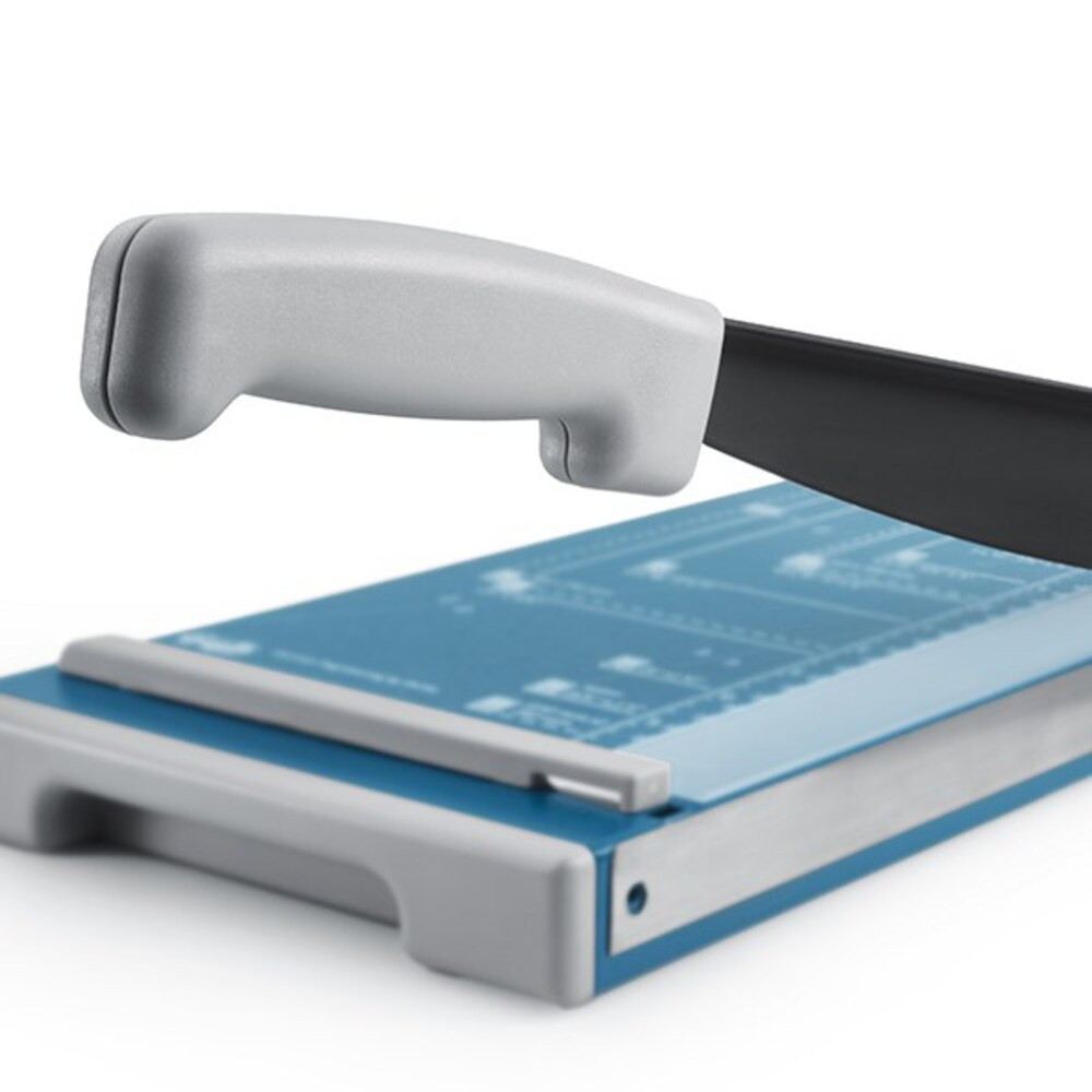 Praktikus, belépő szintű karos vágógép hobbi használatra. Stabil, masszív fémasztal lekerekített élekkel és csúszásgátló gumitalpakkal. Praktikus, süllyesztett markolatok. A vágóél mentén mm-es méretbeosztással ellátott vezetővonalak könnyítik meg a vágandó anyag igazítását. Ergonomikus markolat. Edzett acél felső penge. Alsó acélpenge. A vágandó anyag kézi leszorítással rögzíthető.