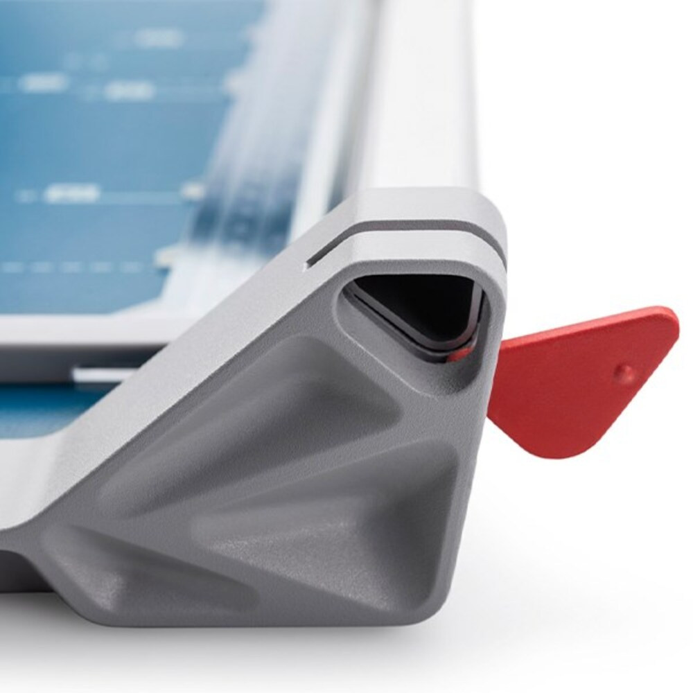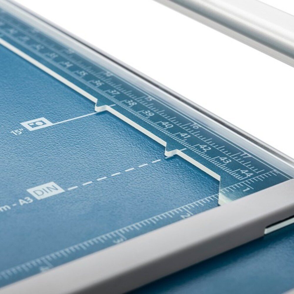 Praktikus körkéses vágógép DIN A3 vágási méretig. Stabil fém asztal csúszásgátló gumitalpakkal, amely lehetővé teszi a körkéses vágógép biztonságos rögzítését. A vágóél mentén mm-es méretbeosztással ellátott vezetővonalak könnyítik meg a vágandó anyag igazítását. Biztonságos, vágófejbe épített csiszolt önélező acél forgópenge. Alsó acélpenge. Zárt, műanyag vágófejbe épített forgópenge. Lapleszorító hasznos jelölésekkel. A vágandó anyag automatikusan rögzül a vágóél mentén. Két méretjelző sáv mm-es léptékkel segíti a pontos, 90°-os vágást. Könnyen cserélhető vágófej.