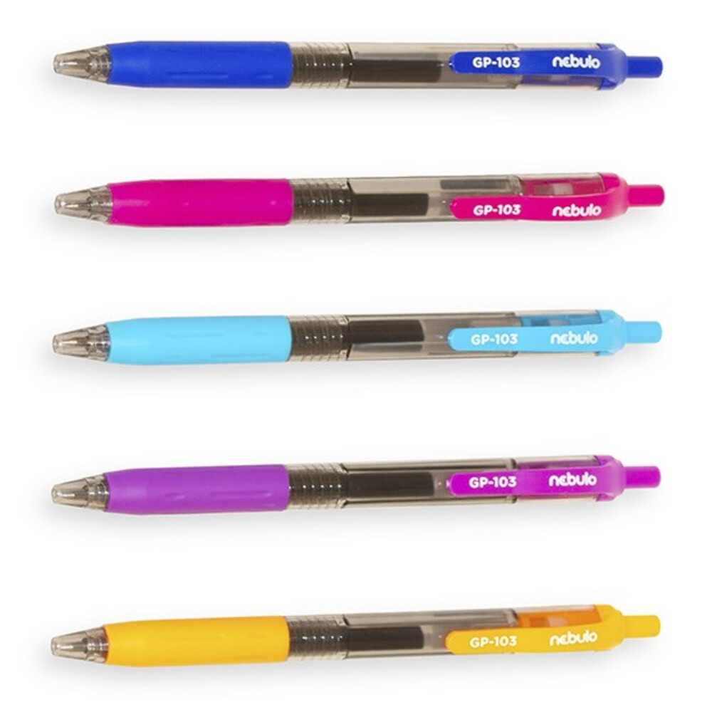 Irodai és általános felhasználásra ajánlott, nyomógombos zselés toll. 0,5 mm írásvastagság; kék tintával ellátva, vegyes tolltest színek, 30 db-os átlátszó kínáló pohárban.