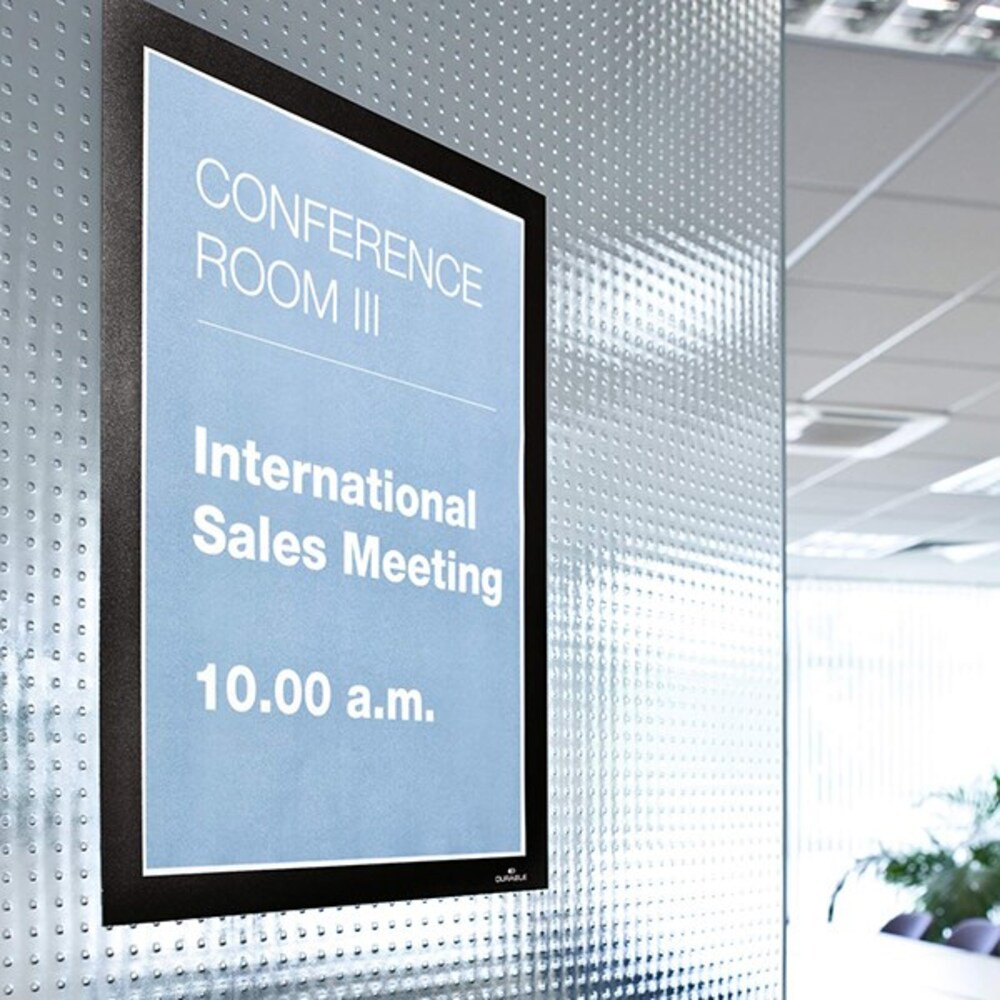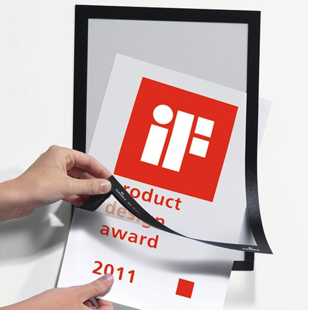 A4 formátumú öntapadó infokeret, iInformációk magas színvonalú és professzionális megjelenítése. A felhajtható mágneses keret gyors dokumentumcserét tesz lehetővé, segédeszközök nélkül egyszerűen felhelyezhető sima, teherbíró felületekre. Pl. üvegről visszaszedhető. A4 formátumú dokumentumokhoz, ideális lehet pl. helyiségek megjelölésére, eligazító információk vagy ajánlatok megjelenítésére. Üveg felületen két oldalról olvasható. A keret mindkét oldalról azonos megjelenésű, Álló és fekvő formátumban is használható. Ingyenesen letölthető, előre elkészített sablonok elérhetőek a www.duraprint.eu oldalon. Külső méret: 236 x 323 mm